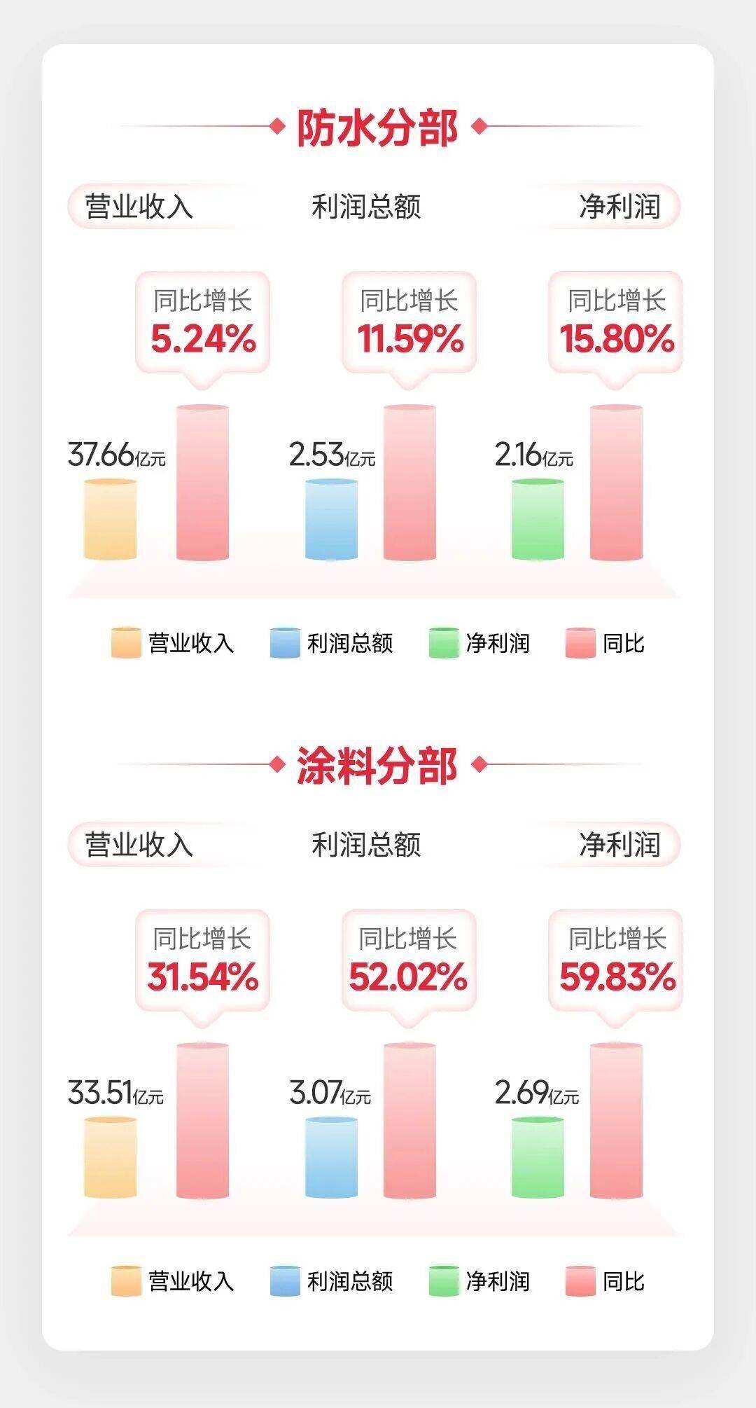 畴前三季度来看,而此中次要是由北新嘉宝莉快速增加鞭策的,嘉宝莉是国内涂料行业领先企业之一,中国最大的绿色建建新材料集团、全球最大的石膏板财产集团。建建粉饰涂料位列全国前四,加强精细化办理,同比增加11.59%;出格是工程营业增加很是强劲,净利润为1.498亿元,而零售营业中的艺术涂料、仿石漆增加也很是强劲。北新建材早正在其部属企业全面推进降本增效工做,同比增加31.54%!